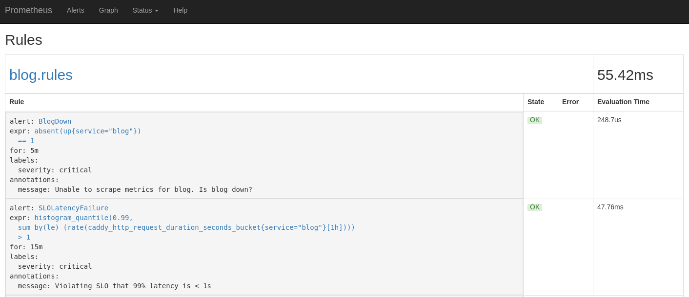 file below, you can see we’ve created three alert rules. The BlogDown alert